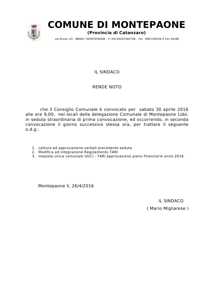 | Oggetto | AVVISO CONVOCAZIONE CONSIGLIO COMUNALE |