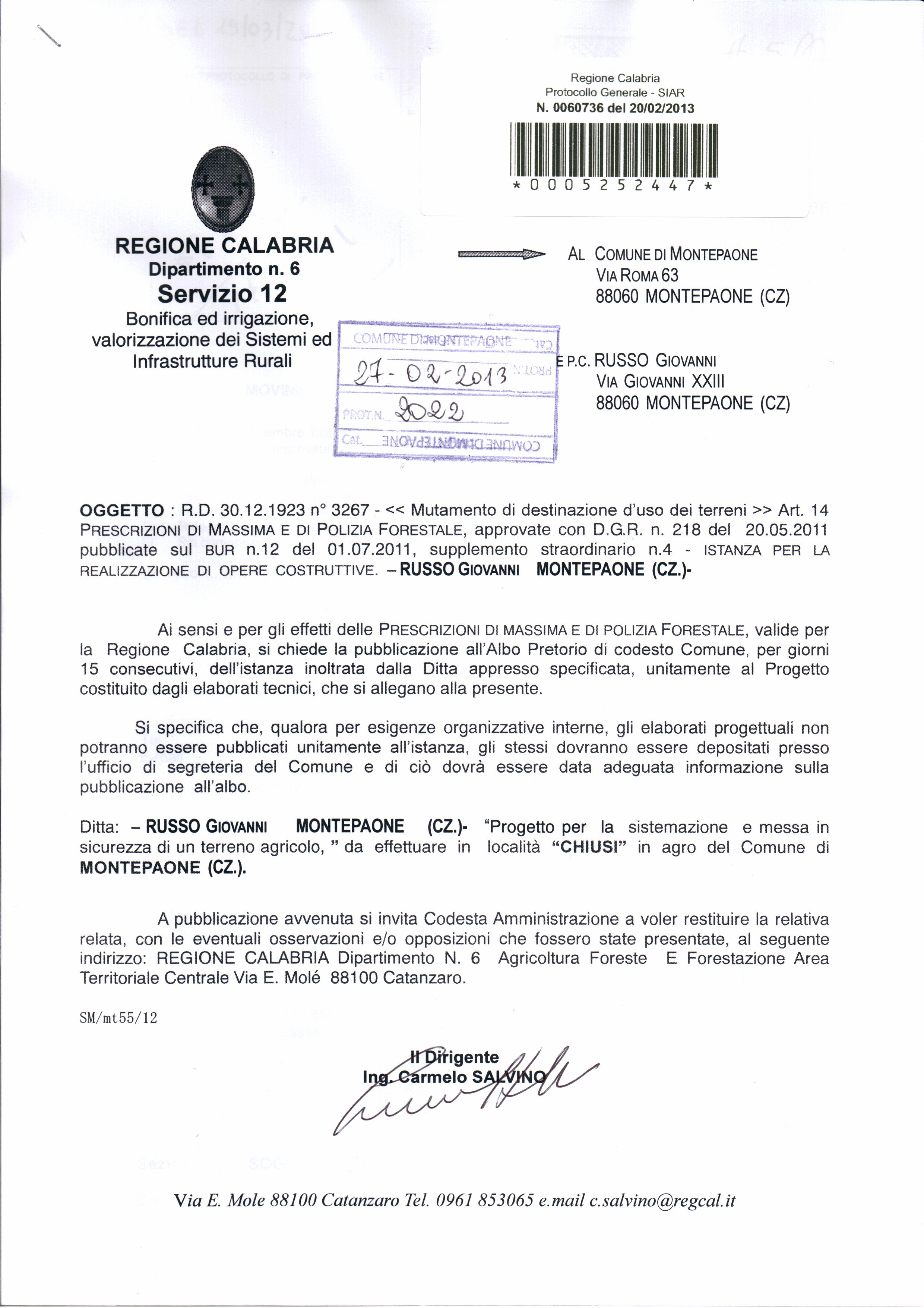| Oggetto | MUTAMENTO DI DESTINAZIONE D'USO DEI TERRENI- ISTANZA PER LA REALIZZAZIONE DI OPERE COSTRUTTIVE. |